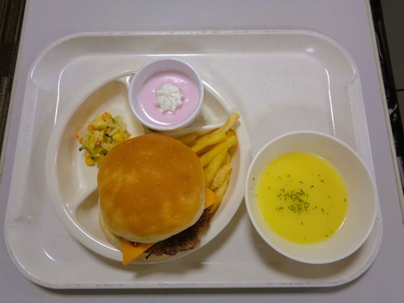 ハンバーガー・フライドポテト・コーンスープ・プリン