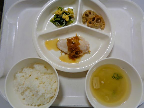 玄米ごはん・よだれ鶏・青菜の卵あんかけ・れんこんの素揚げ・もやしと油揚げの味噌汁