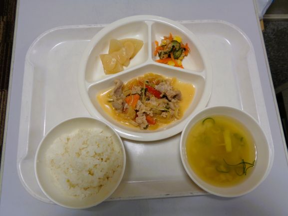 玄米ごはん・豚肉と玉ねぎのマヨポン炒め・胡瓜のさっぱり和え・ふろふき大根・麩とわかめの味噌汁