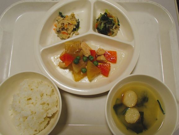 玄米ごはん・酢豚・春雨の酢の物・杏仁豆腐・中華スープ
