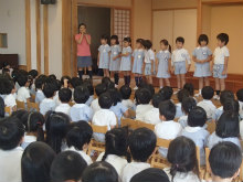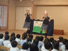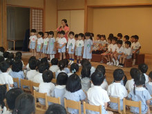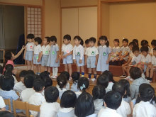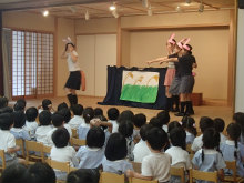 9月のお誕生会をしました。23名のお誕生日の子どもたちのお祝いをしました。(年少8名、年中6名、年長9名)一つ大きくなった子どもたちは、嬉しそうに自分の名前を舞台で発表していました。 子どもたちのお祝いの歌は年少『かまきりおばさん』、年中『秋のバイオリン』、年長『手のひらをたいように』で、子どもたちが今大好きなカマキリやコオロギが歌にも登場していました。先生たちの劇は、十五夜の準備をするうさぎさんのお話でした。十五夜は9月27日です。今年は雨の多い秋ですが、大きくてきれいなお月様を見て楽しめたらいいなと思います。