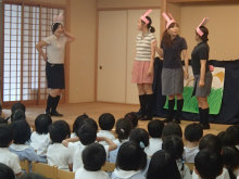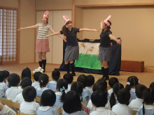 ▼先生たちの劇:うさぎさんたちが、十五夜のお祭りで踊るダンスの練習をしています。
