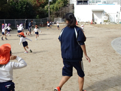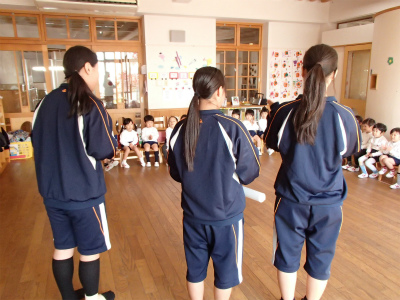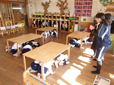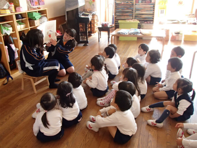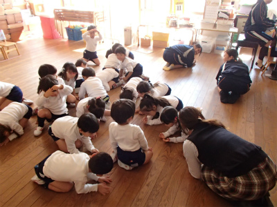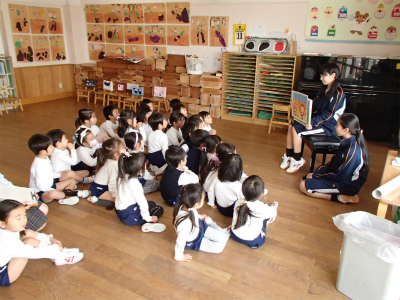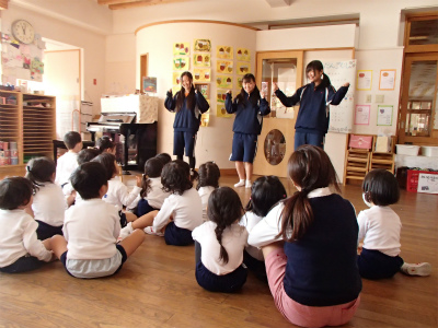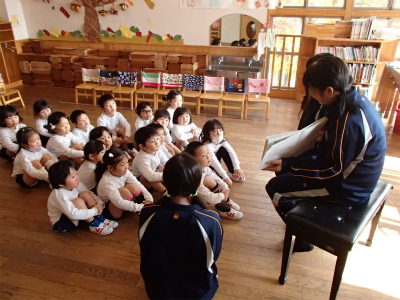 近隣にある兵庫県立宝塚東高等学校から3年生の生徒さんが「ふれあい育児体験」に来られました。今回は「防災」というテーマで子どもたちに絵本や紙芝居を読んでくれました。この日のために3年生のお姉さんたちは、絵本を読む練習をしたり、どういう言い方をしたら子どもたちに伝わるのか一生懸命考えてくれたそうです。年少4クラス、年中3クラス、年長1クラスに分かれて、各お部屋で自己紹介、絵本や紙芝居、ダンスやクイズなどをしてくれました。30分という短い時間でしたが、子どもたちも大喜びでお姉さんとのふれあいの時間を楽しんでいました♪お姉さんたちは保育士や幼稚園の先生に関心のある方たちばかりということなので、今回の「ふれあい育児体験」をして、将来実際に保育の仕事に就く方がいるかもしれませんね。