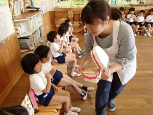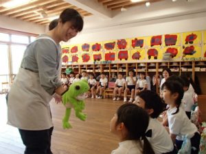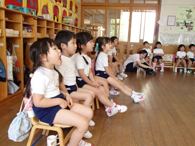 6月4日は虫歯予防デーです。幼稚園では、年中組の子どもたちが養護の先生に歯磨き指導をしてもらいました。歯磨きが大嫌いなカエルくんを連れてきてくれたのですが、その口の中をのぞいてみると…バイ菌がいっぱい!カエルくんがうがいをした後のお水を見てみると、食べカスがたくさん!汚れたお水を見た子どもたちはとてもビックリしていました。「ご飯の後にしっかり歯磨きをしないと、カエルくんみたいにバイ菌だらけになるよ~」と言われ、子どもたちは真剣な表情に。みんなで実際に歯ブラシを持って、①歯の頭のところ②歯の裏側③歯の表側を磨いてみました。いつもはサッと終わらせてしまう歯磨きも、カエルさんの口の中を見た直後の子どもたちは時間をかけてじっくり磨いていました。ご家庭でもお子様と歯磨きのしかたについてお話ししてみてくださいね♪