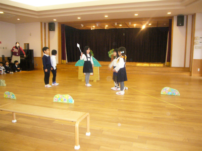 子どもたちに指導するものですが、中山台幼稚園の「生活発表会」でする「劇遊び」は、