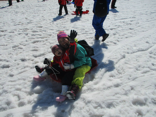 ので、ちょっと暑いくらいです。子どもたちは、二人一組になってそりに乗り、満面の笑みを