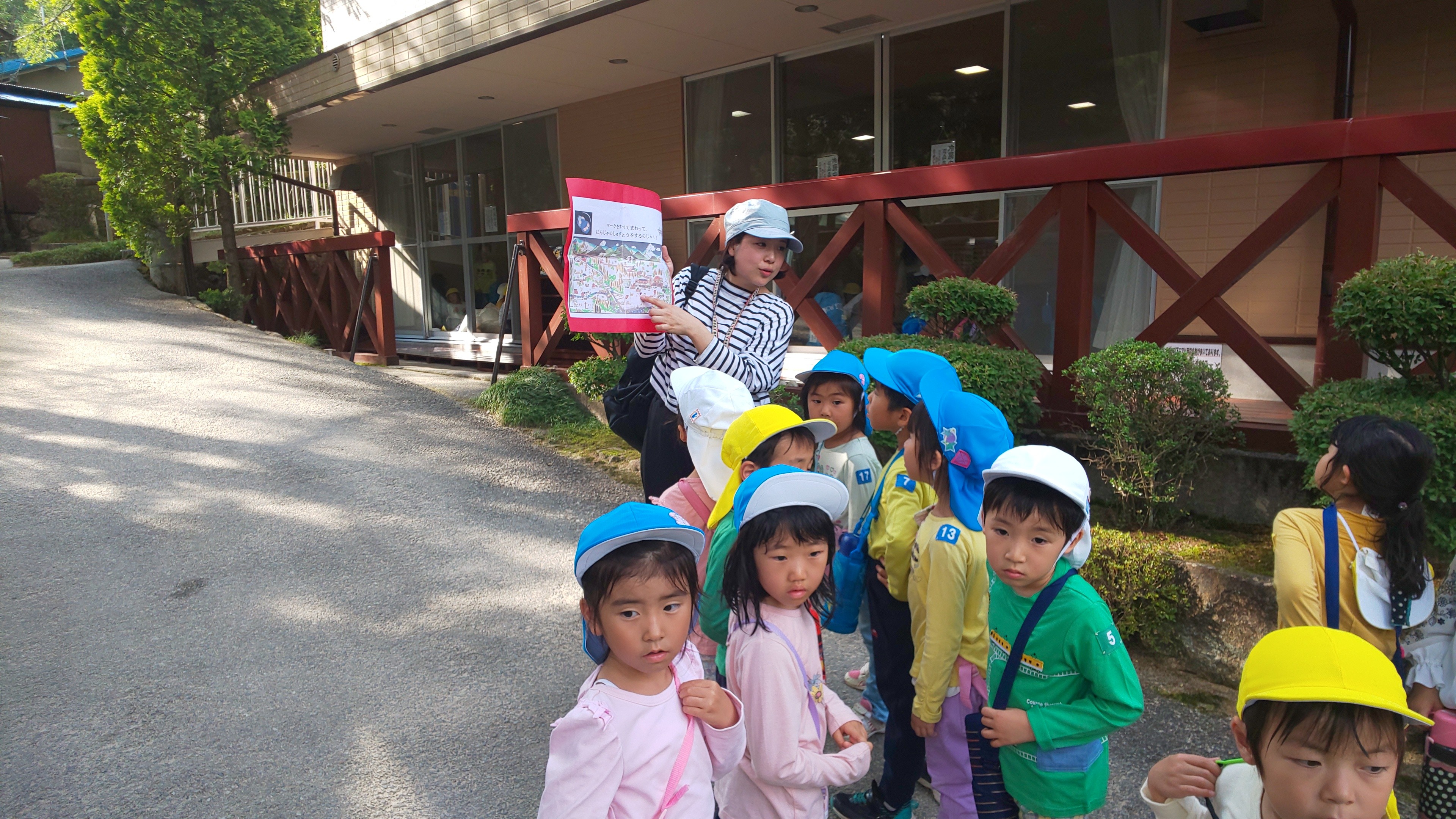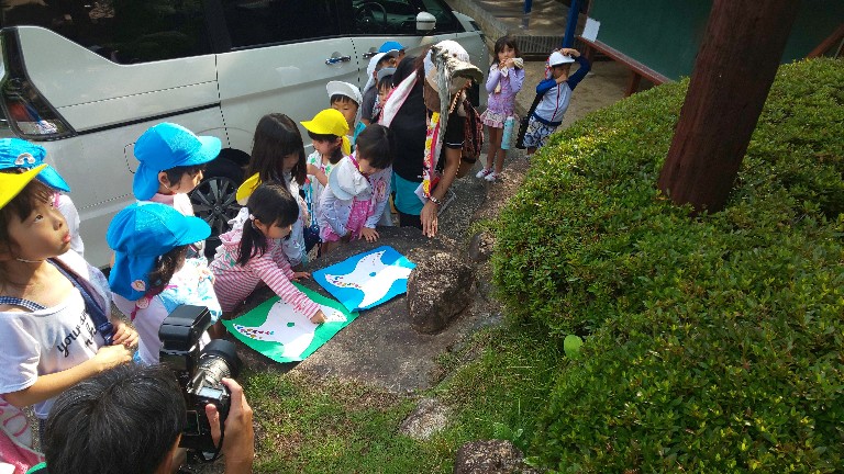 オリエンテーリングは、次の4箇所を回ります。手裏剣の的当て、 忍者クイズ、新聞じゃんけん、だるまさんが転んだ忍者バージョン。全て回ったら8っのグループが、 それぞれ一つピースをGETします。明日の朝、各グループが8っのピースを持ち寄り、合わせると、 さてどうなるのでしょうか?