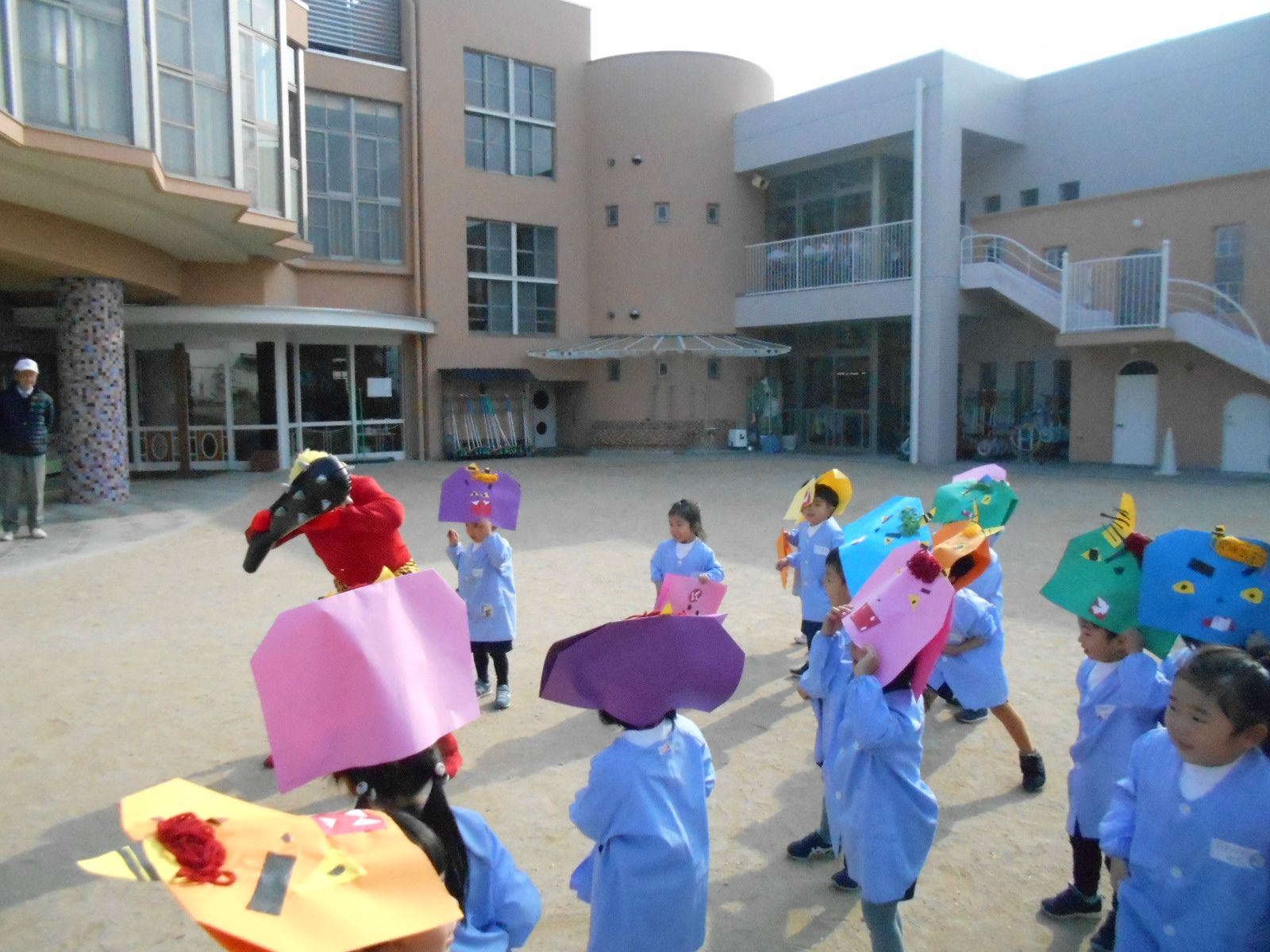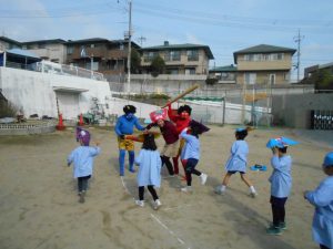 今日は、節分の日で幼稚園でも豆まきをしました。朝から子どもたちも「鬼さん来る?」とどこかソワソワ・・・豆まきは、邪気を追い払うためとして、古くから豆まきの行事が行われていて、鬼に豆をぶつける事により、邪気を追い払い、一年の無病息災を願うという意味合いがあるようです。保育室でも先生から皆の心の中にいるどんな鬼さんを退治したい?の問いかけに「怒りんぼう鬼!」「夜寝ない鬼!」「忘れんぼう鬼!」と口々に退治したい鬼さんを話していたようです。手作りのお面を被って園庭に出てきましたが、みんな鬼が何処から来るかドキドキ・・・へっぴり腰になりながら豆を握りしめて。鬼が出てくると「鬼は~外!!」と元気に豆を投げる子や、担任の先生にべったり引っ付いている子等反応は様々でした。最後は、皆で声を揃えて「鬼は~外!」と元気いっぱいに豆を投げると鬼は弱くなって逃げていきました!今年一年皆、病気やケガなどせず元気に過ごせますように。