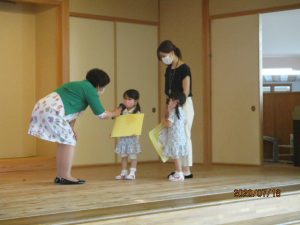 昨年度より開校しました未就園児クラスの「どんぐり組」ですが、3月に行うはずであった修了式が、新型コロナウイルスによる休園や大雨警報で、延び延びになり、やっとのことで7月18日(土)に20組が参加して行うことが出来ました。一人ずつ名前が呼ばれ、ホールの舞台に登壇し、「どんぐり組」の飯島仁美先生から、修了証書が手渡されました。