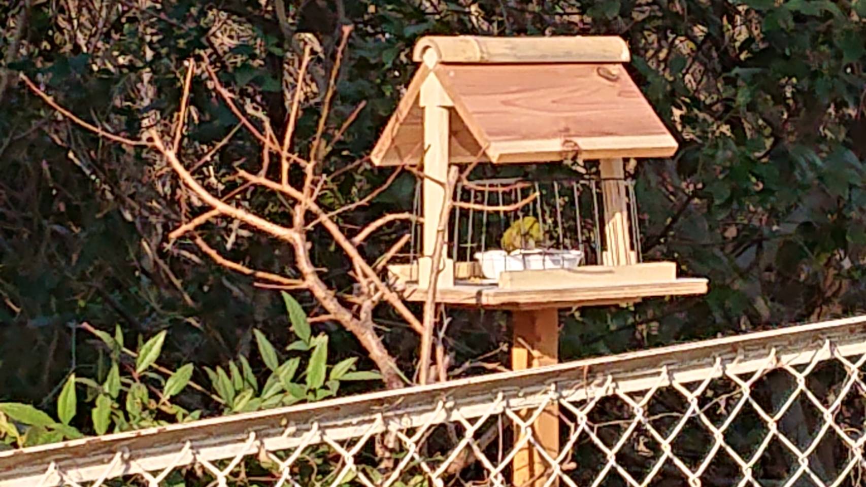 メジロが通れるほどの隙間のあるかごに入れ、メジロがヒヨドリから襲われることを防ぐよ