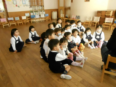 ホールに年中さんと年長さんの音楽会の歌と合奏を見せてもらい
