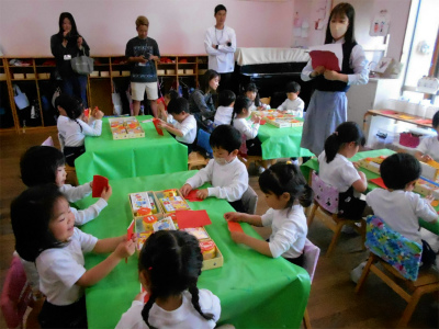 年長組では、折り紙でかぶとやつばめ、てんとう虫等など