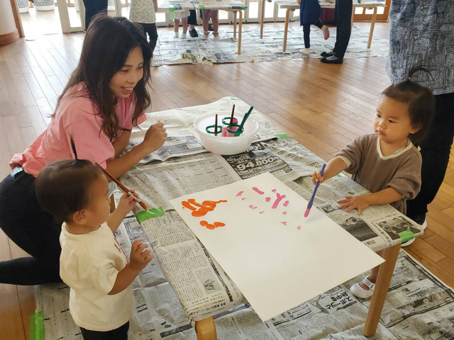 そして今日は「絵の具遊び」です。4つのコーナーを設けて自由に選ぶことが出来ます。スタンピングや手形や自由画や点々遊びなどどれも楽しそうで、子どもたちも嬉しそうに選んでいました。