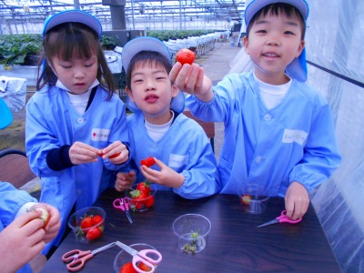 今日は年長組のいちご摘み遠足がありました。