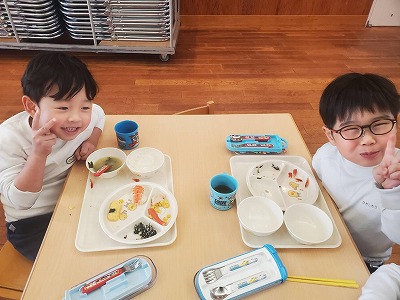 今年度より始まった長期預かり保育(春休み・夏休み・冬休み)そして午前保育後からの預かり保育で給食提供に
