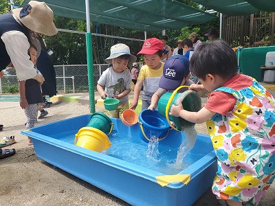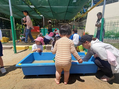 少しづつどんぐり組の先生とお団子作りやシャベルで道を掘り始めると、笑顔も見られるようになり特に後半のBクラスは日差しも出始め、水遊びも気持ちよく感じるほどに!終始どろんこ遊びに夢中になっていました。