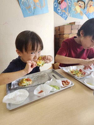 色鮮やかな夏野菜とトロ~リと溶けたチーズがとても美味しかった様でパクパク食べていました。自分たちでクッキングをすると苦手な食材も食べられたりして「食」に興味をもてる経験ができました。