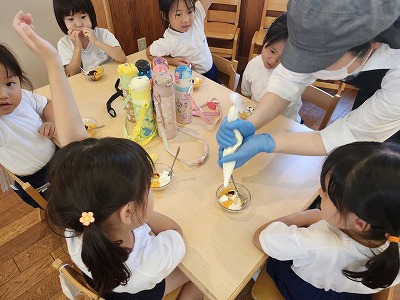 おやつのクッキングでは「パフェ作り」や「蒸しパン作り」