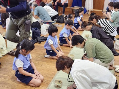 幼稚園の正門をくぐられる表情もとても温かく、ご挨拶をさせていただきながらわたしも気持ちがほっこりいたしました。ホールでは、子どもたちが正座をして「今日はお越しくださりありがとうございます」とご挨拶から始まり、お菓子とお抹茶をお出ししました。