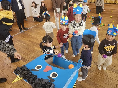 今回は豆まきに因んでお面を作って遊びましたが、その時間にも皆と一緒に楽しめる時間が増えたり作ることを楽しめるようになる姿など嬉しい発見が沢山ありました♪