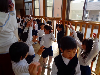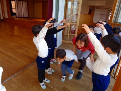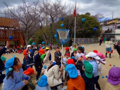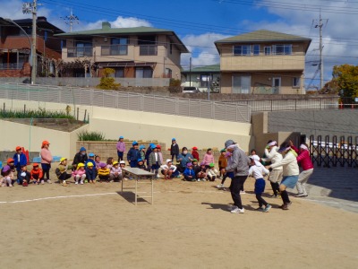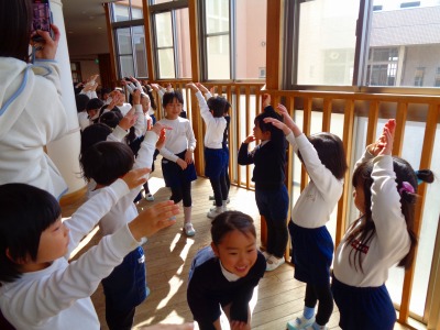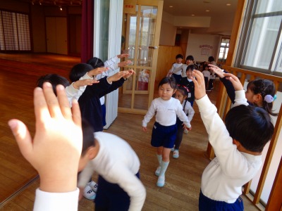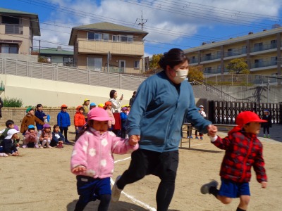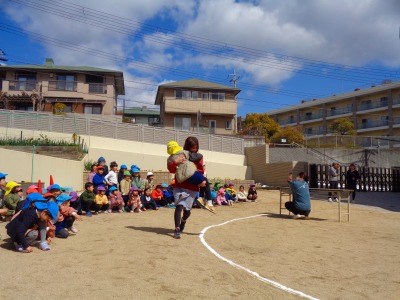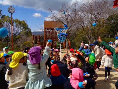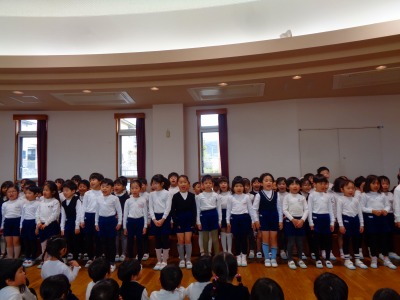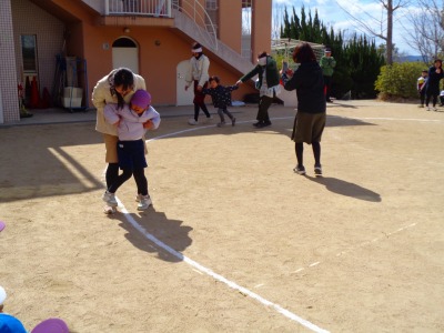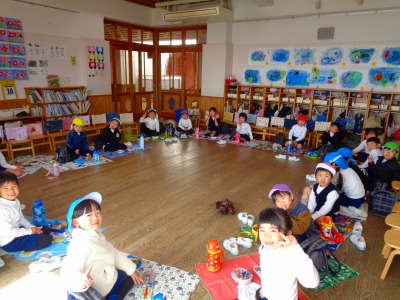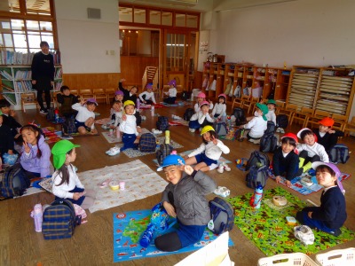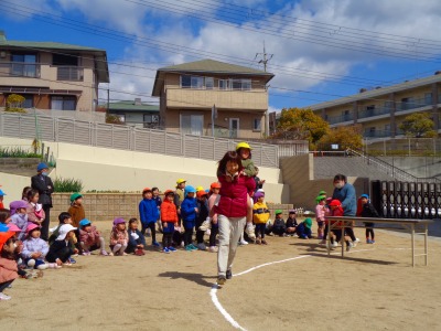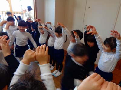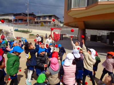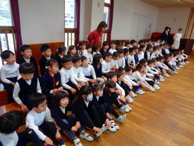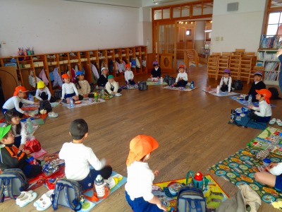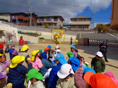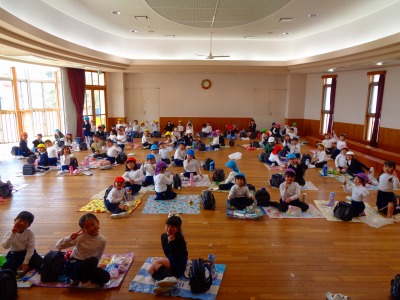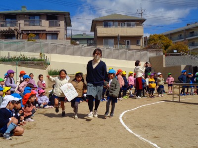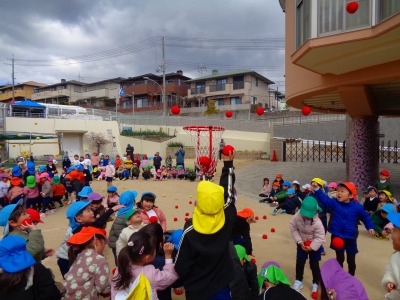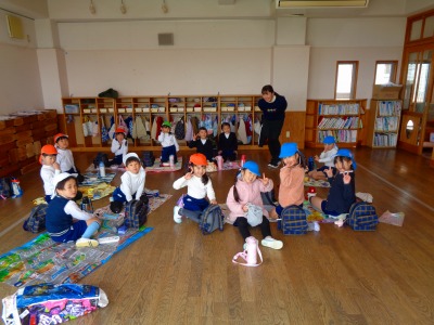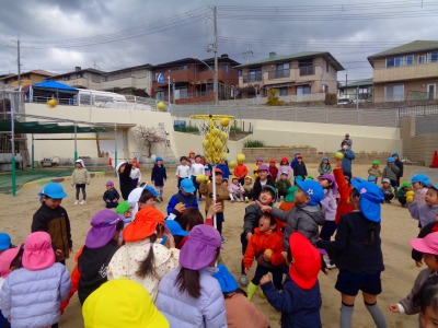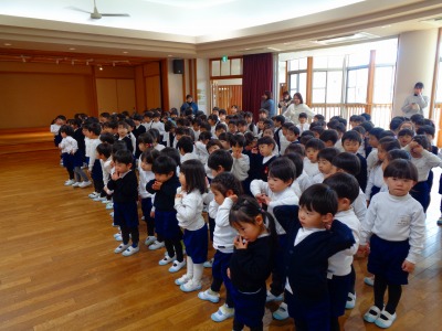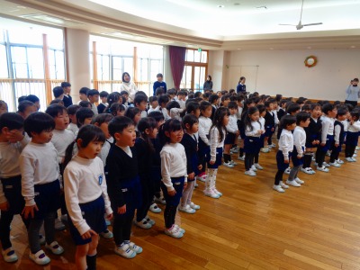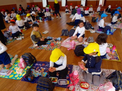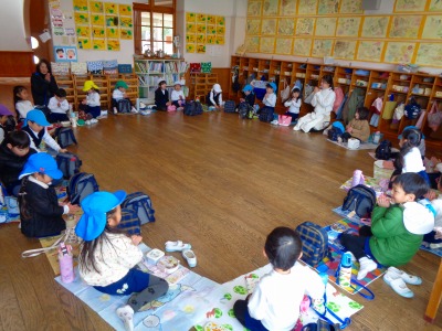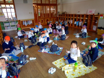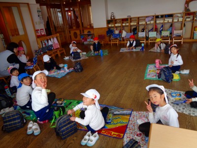 その後、園庭で全学年登降園のバス・個人コースに分かれて